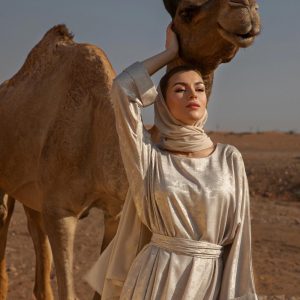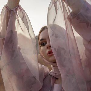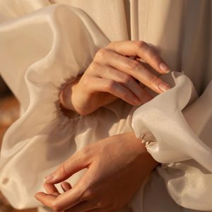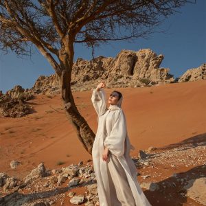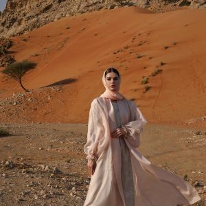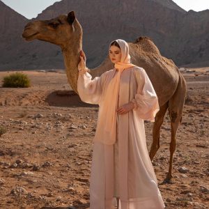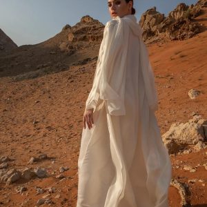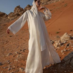 A cream abaya tailored from sheer pure silk organza. Comes with a matching Sheila and an inner dress made from a soft crepe fabric with button detailing going down the center.A true embodiment of elegance with this light and flowy organza abaya.