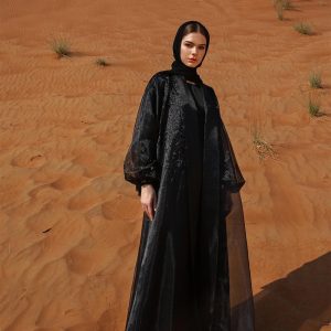 A seamless organza abaya with our exclusive Suuf print and puffy sleeves. A must have feminine, staple piece. Comes with a matching inner dress and Sheila.