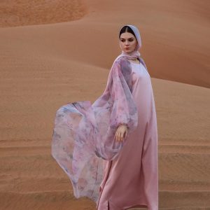 A Luxurious crinkled pink organza abaya with sophisticated poet sleeves that highlight the sheen of the fabric. Comes with a matching Sheila, belt, and a metallic inner dress with beige and silver hues.