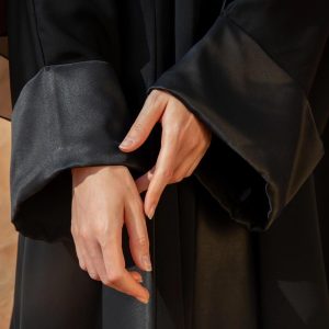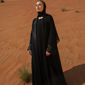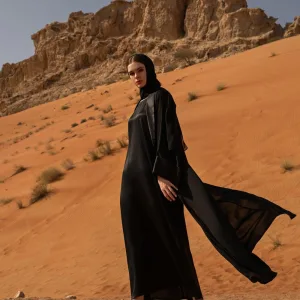 A classic black abaya with our signature intricate satin panel shawl going down at the front and cuffed arms. Comes with a matching Sheila and inner dress.