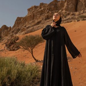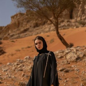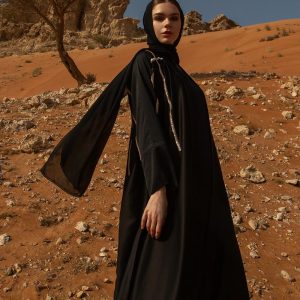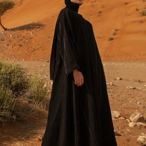 A luxurious black abaya made with nature’s most exquisite fabric. The collar is delicately tailored with abstract triangular patches and cuffed arms made with a satin fabric. Comes with a black inner dress and Sheila.