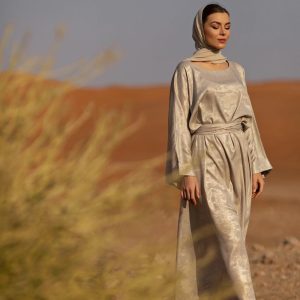 A metallic beige opulent dress with silver hues made from the finest fabric. A flawless embodiment of radiance where shimmer comes from within. Comes with a matching Sheila and belt . A simple yet elegant dress perfect for any occasion.