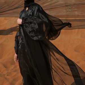 A black organza abaya lined with soft chiffon and embellished with geometrical beadwork along the front and back. Comes with a matching Sheila.