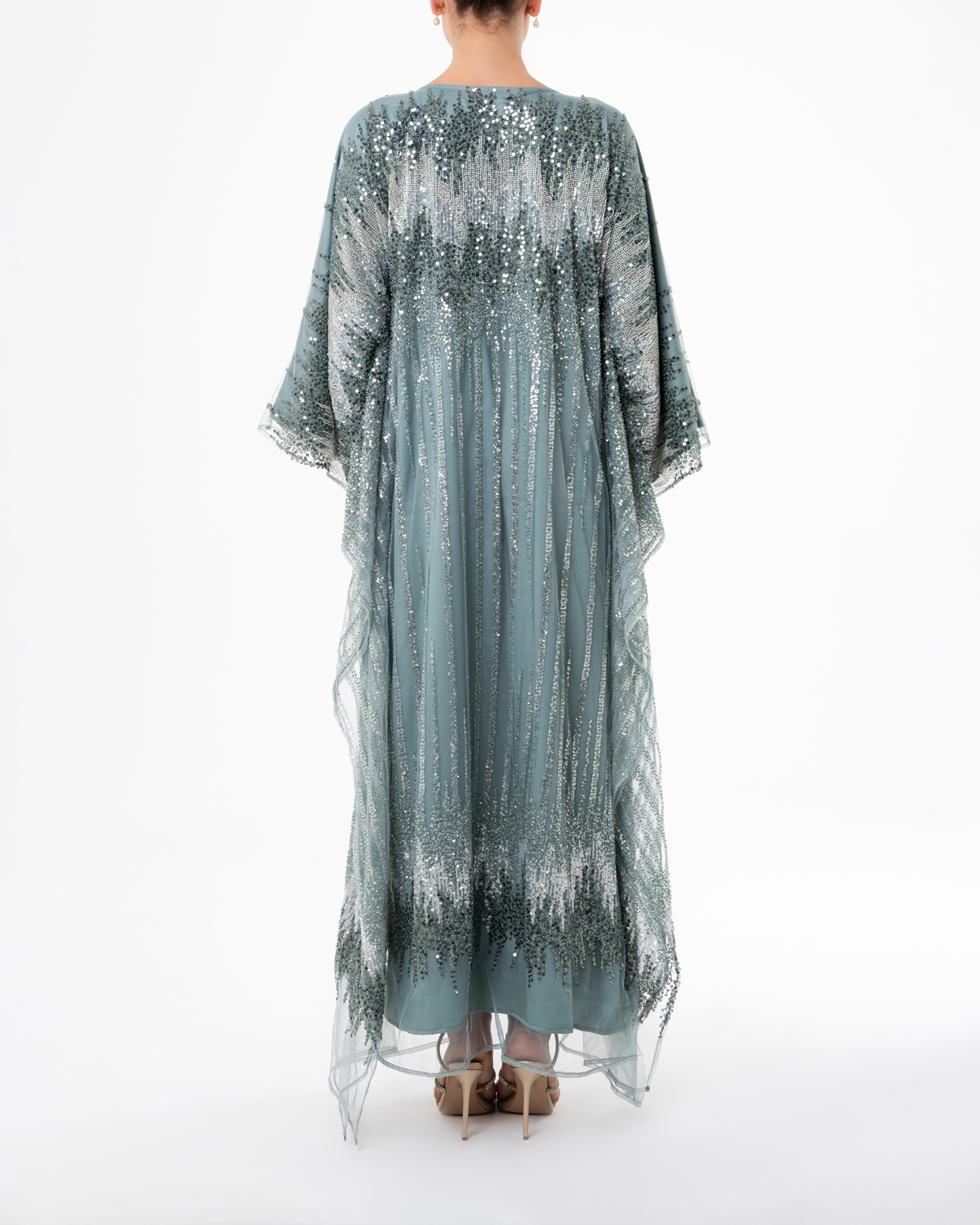 The Alya Mist Kaftan by SUUF captures ethereal elegance in shimmering silver-blue sequins. Flowing from hand to hand in a seamless silhouette, it reflects light with every movement, creating a vision of calm sophistication and modern femininity. Perfect for evening wear and refined occasions.