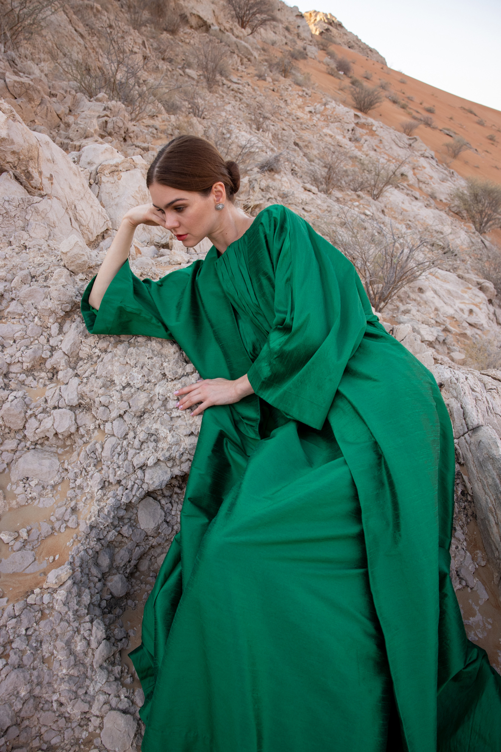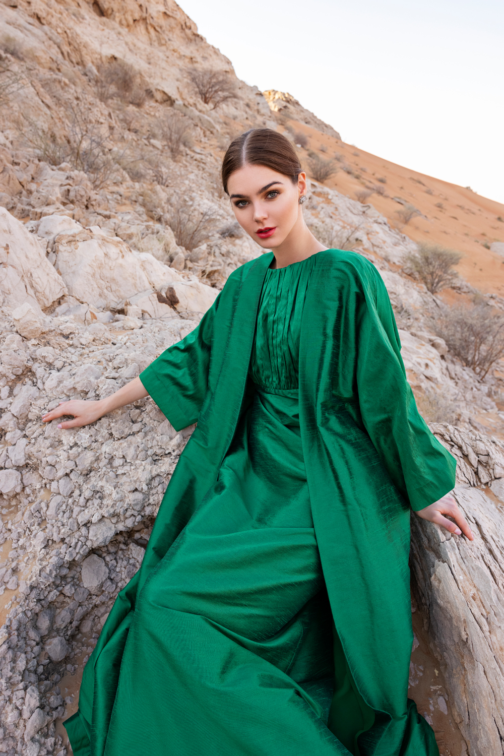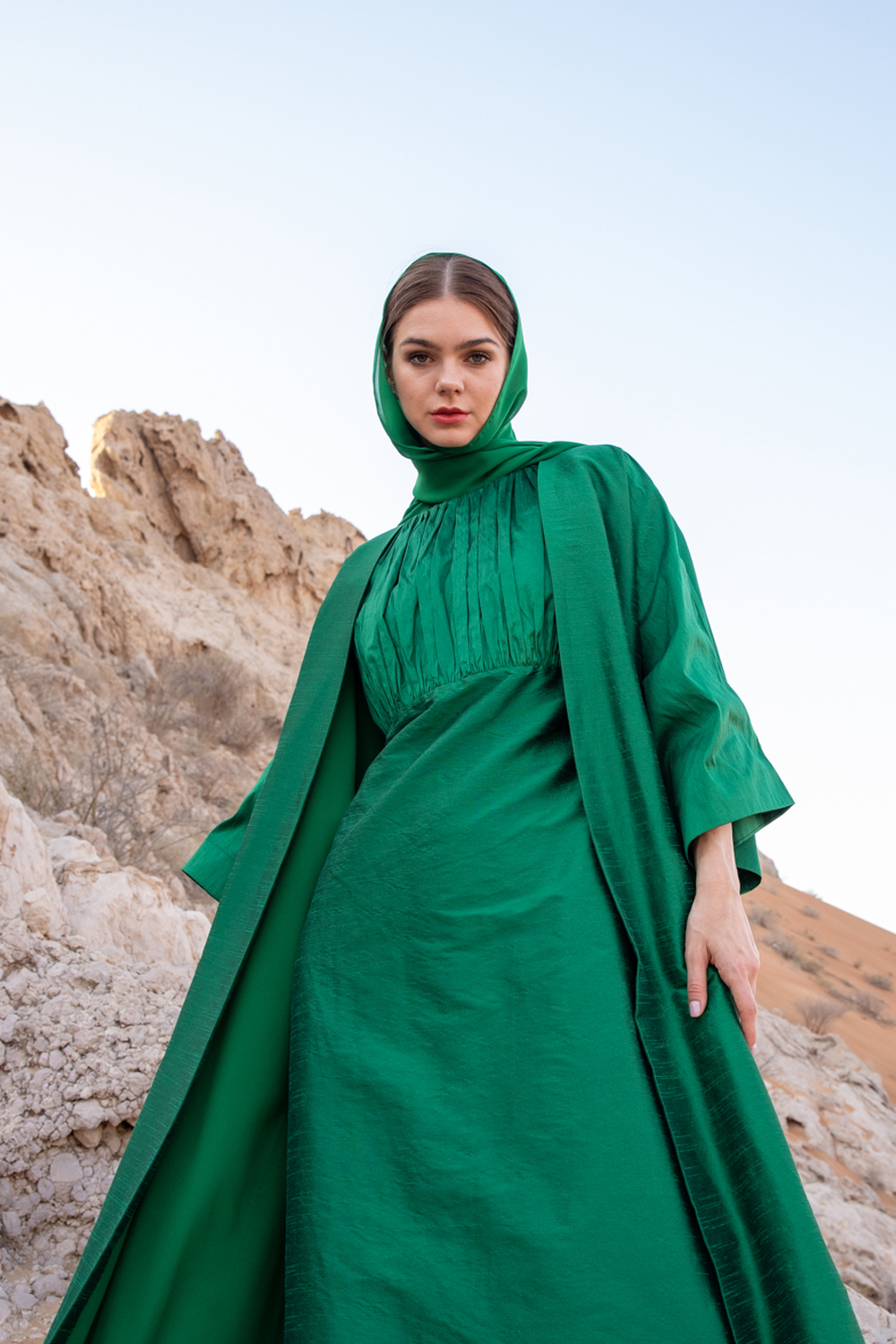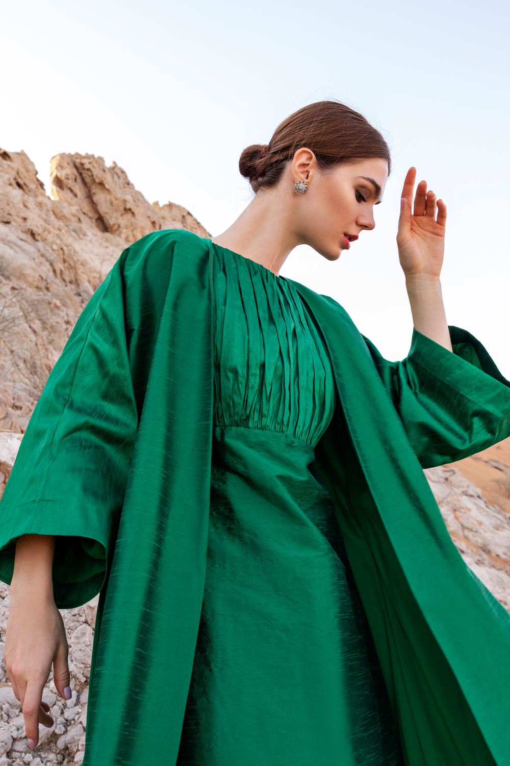 Structured green raw silk abaya. A voluminous fabric tailored to give an elegant look. The inner dress has a sheath silhouette with a draped bodice. Comes with a matching Sheila.