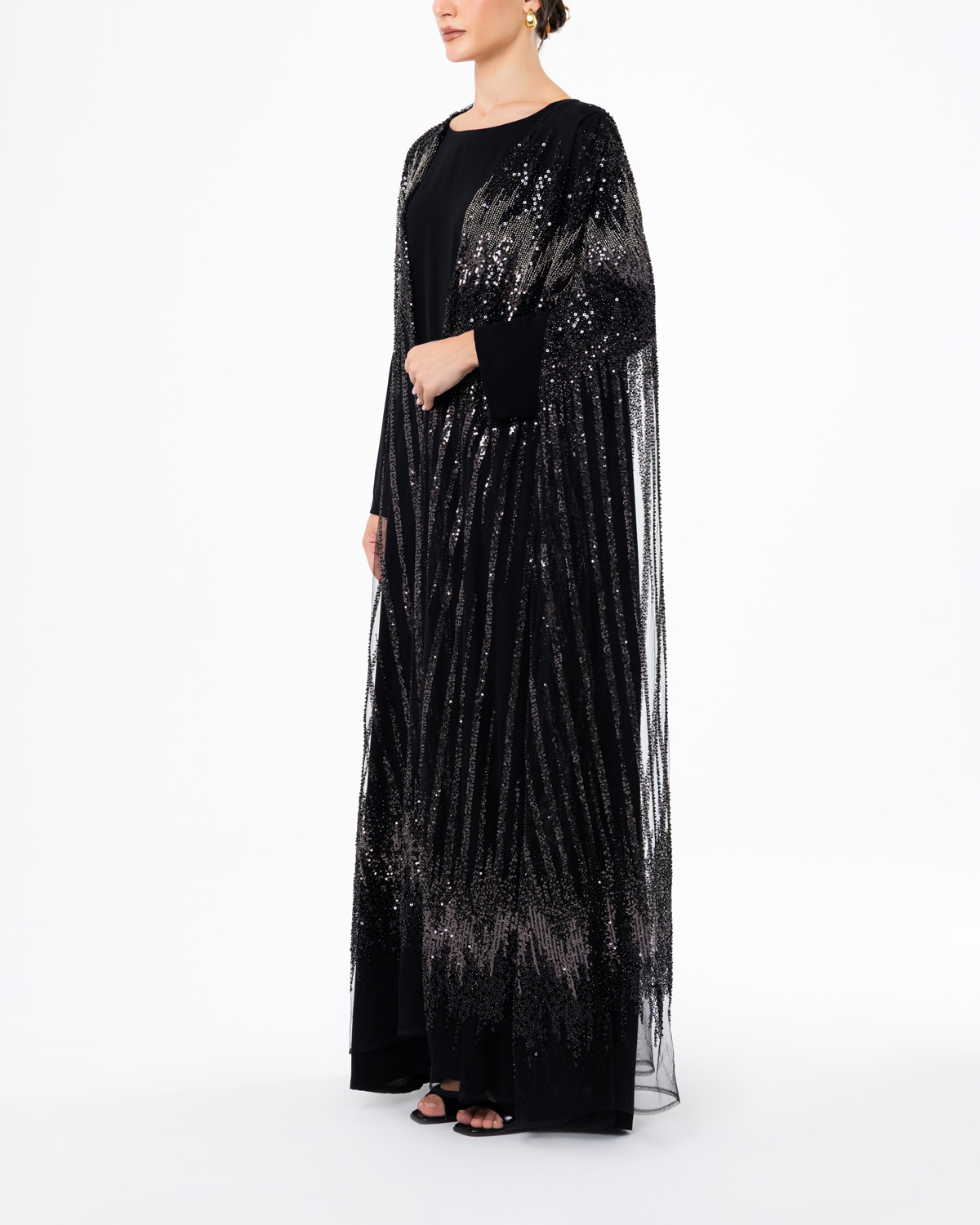 Created for the woman who commands understated luxury, Layali Noir transitions seamlessly from intimate gatherings to grand soirées, a timeless evening wear abaya that radiates luminous sophistication.