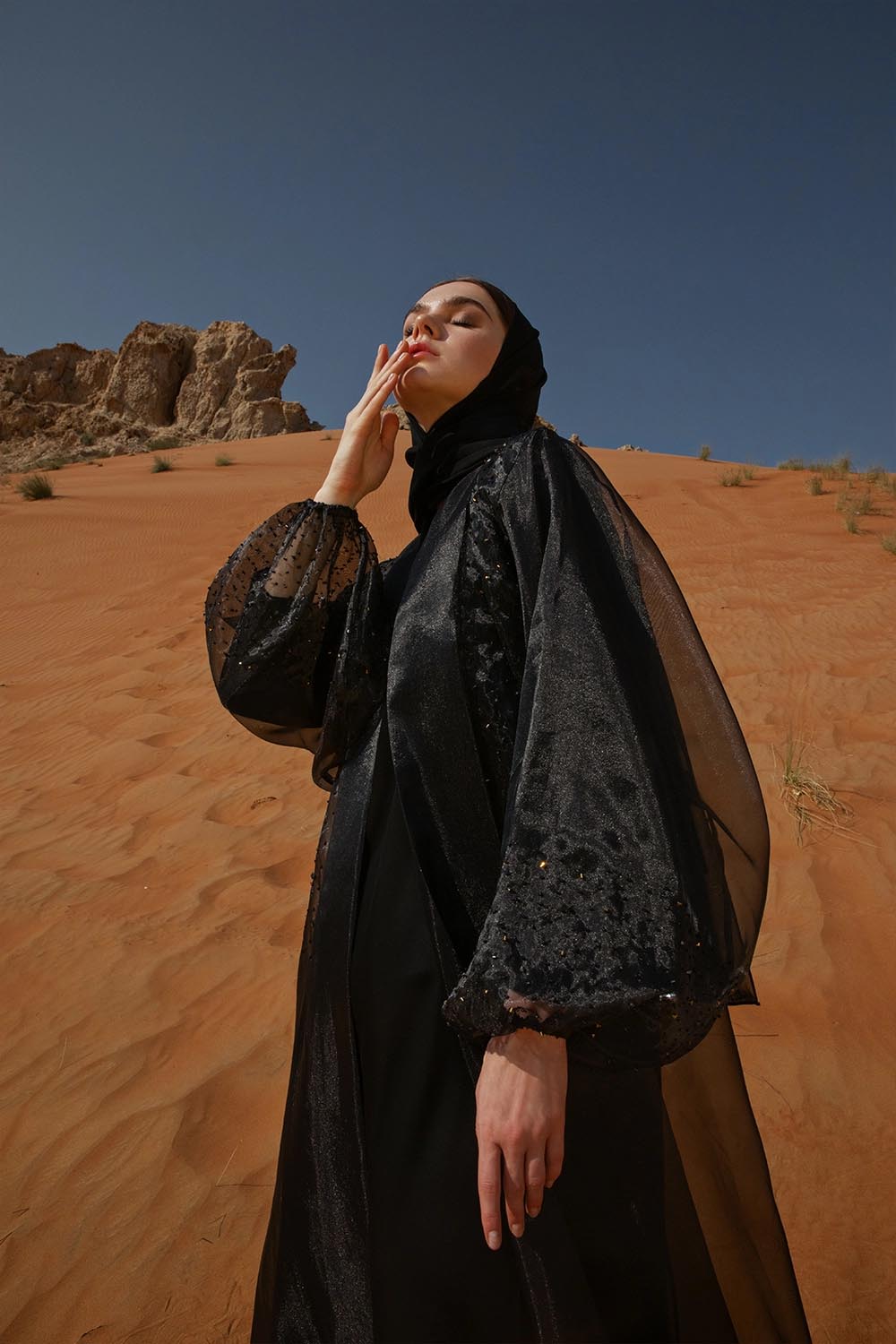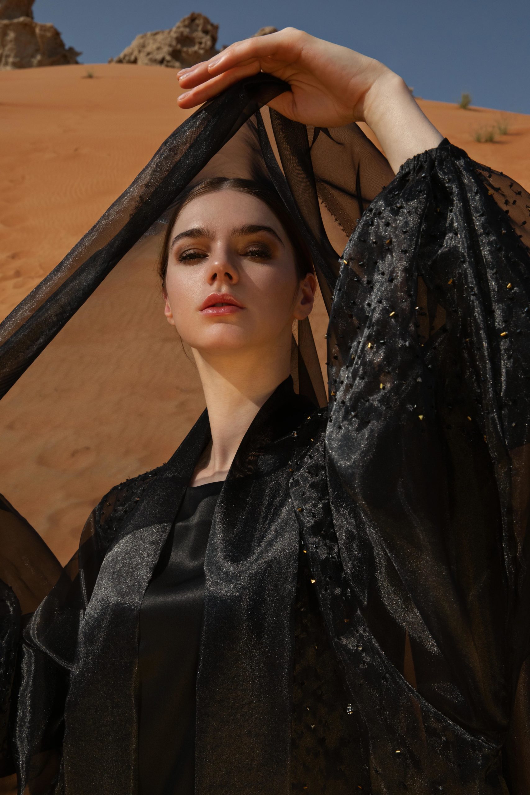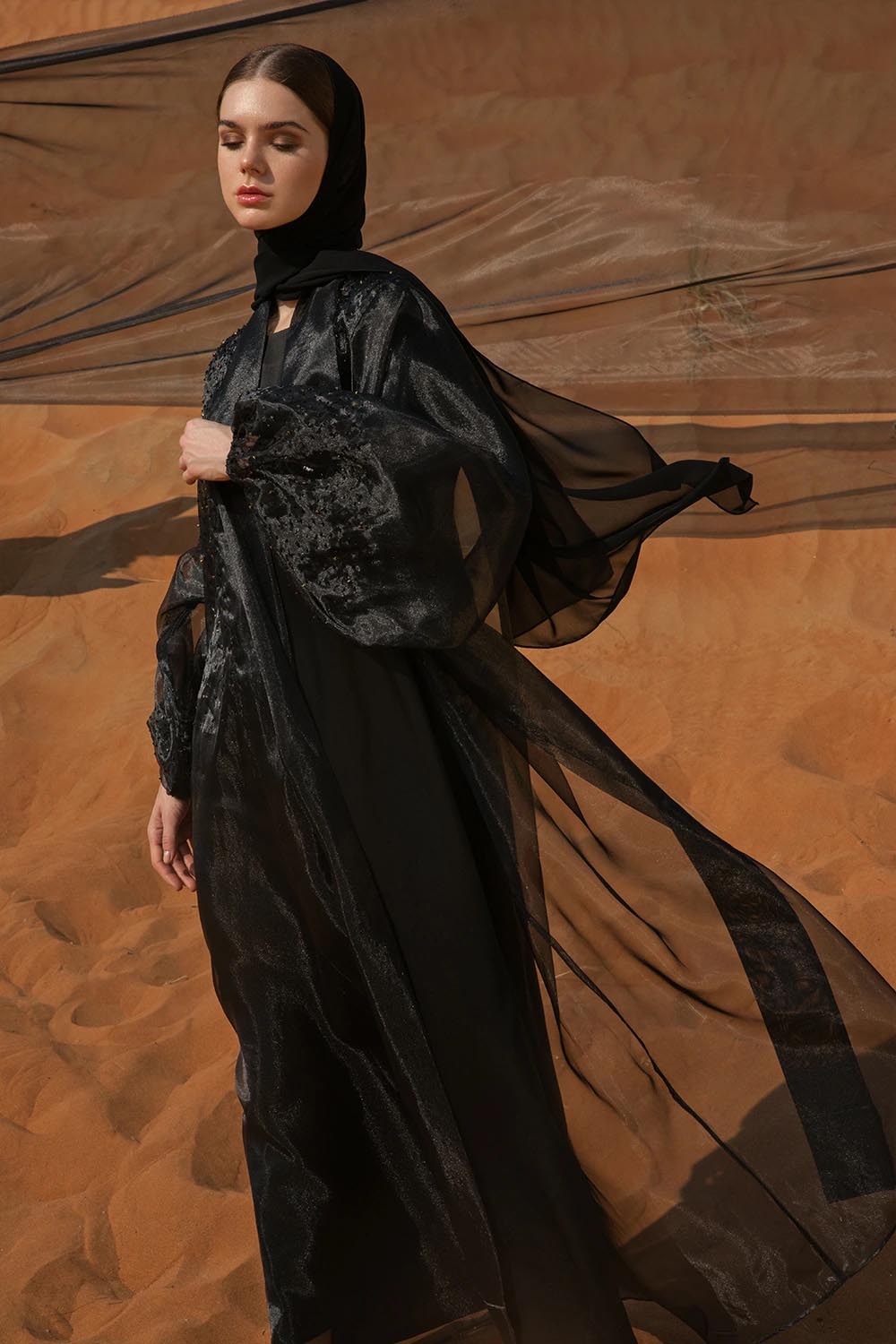 A black pure silk organza abaya. The bodice and sleeves are intricately hand embellished with beads and crystals in shades of black, grey and gold. Comes with a black inner dress and Sheila.