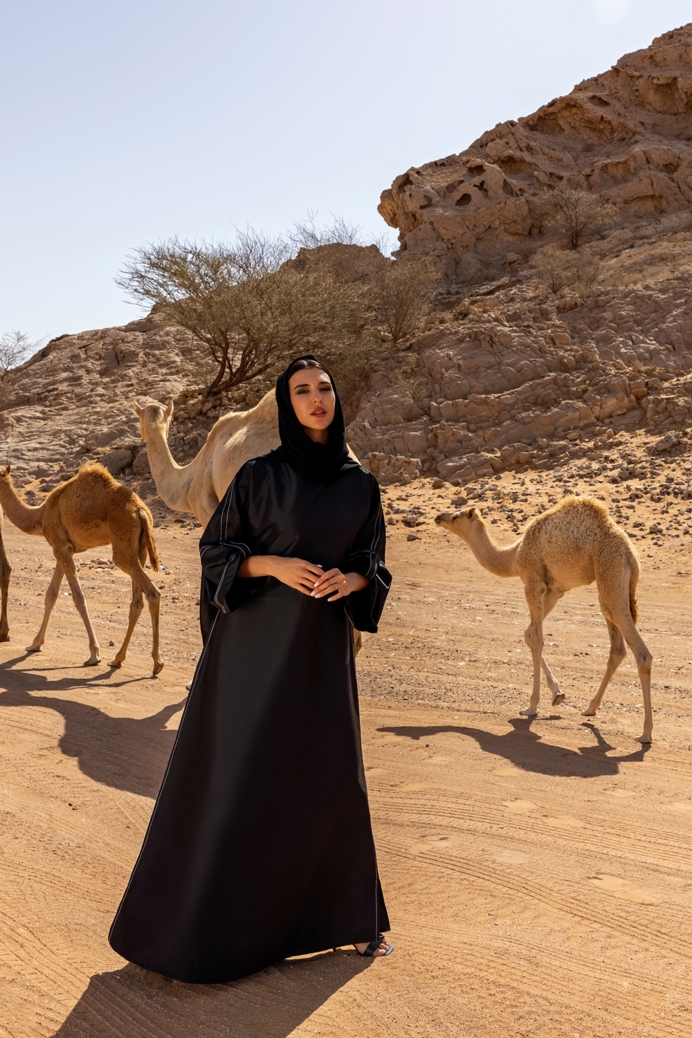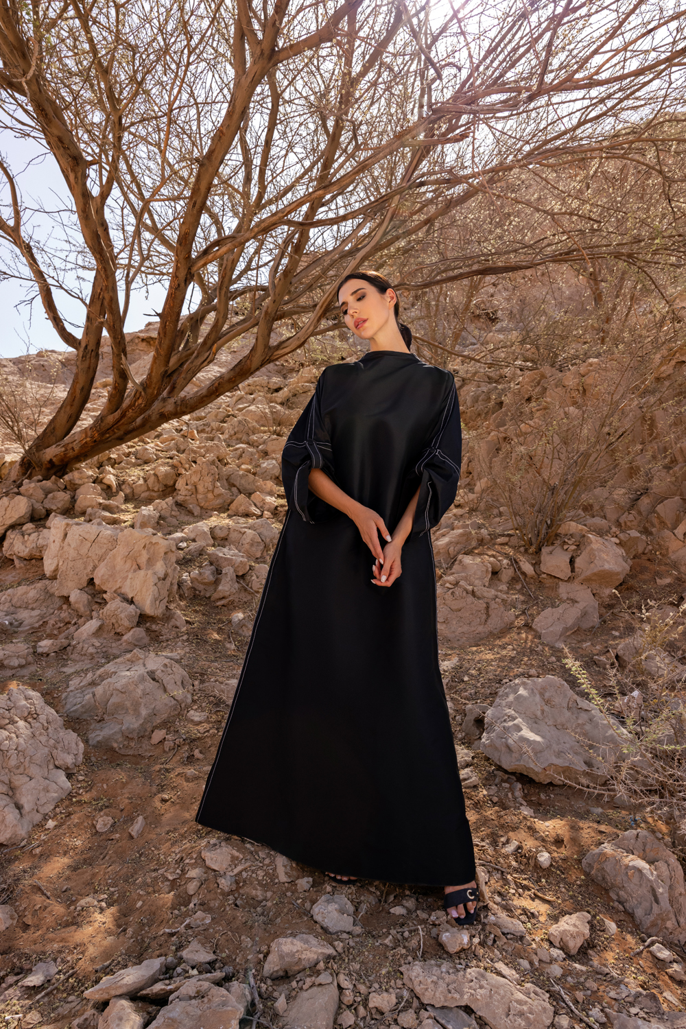 A black structured taffeta kaftan. Detailed with white contrasting stiches and roll up tabs to give a casual look. Comes with a matching Sheila.