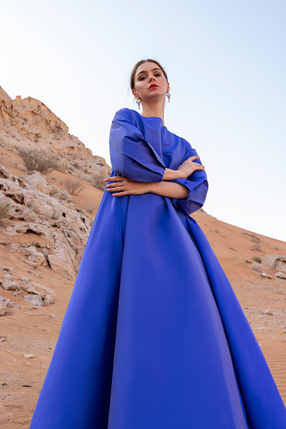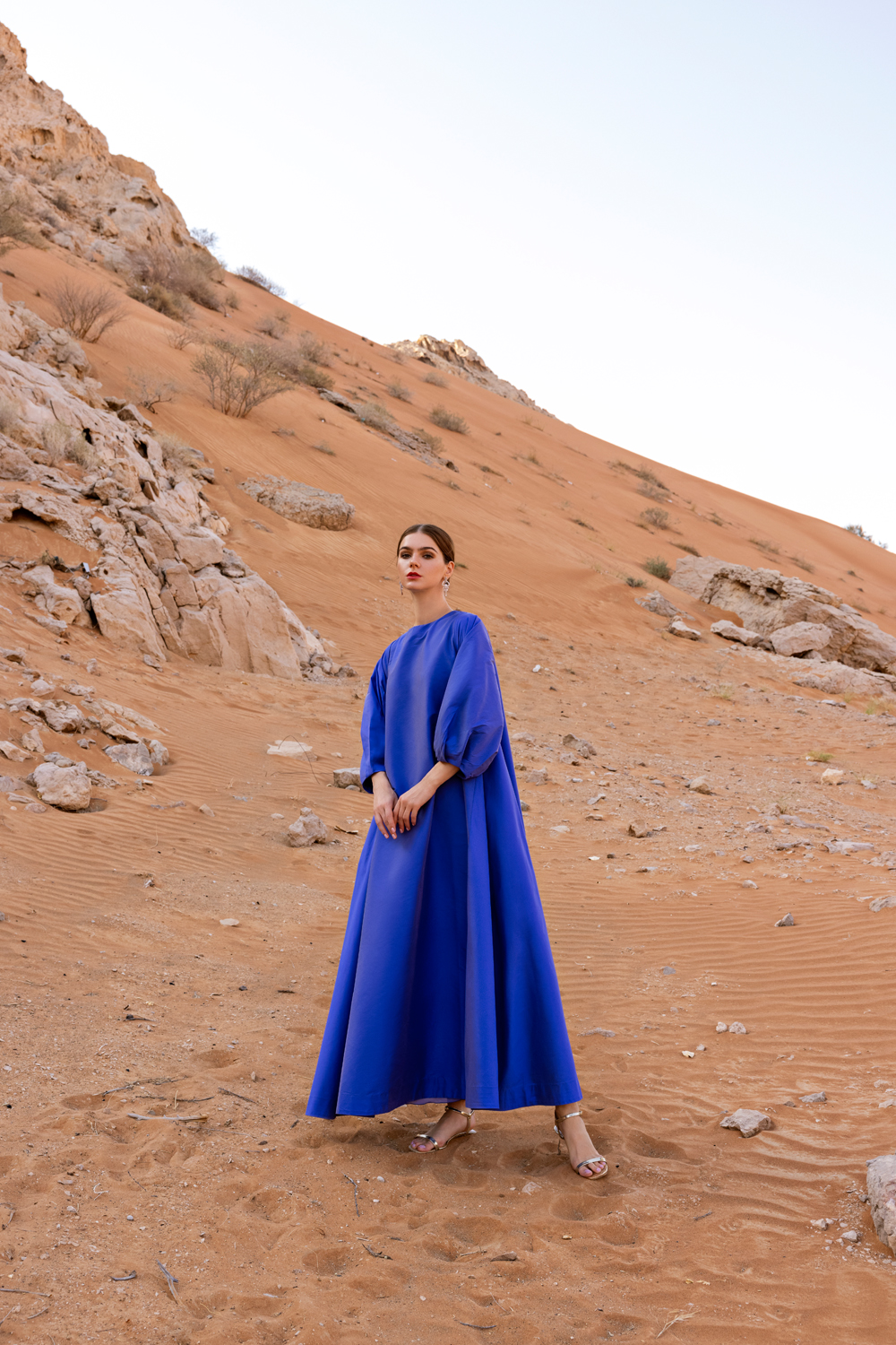 A royal blue trapeze kaftan perfect for the festive season. The sleeves are pleated bishop that accentuate the arms to give an elegant look. Comes with a matching Sheila.