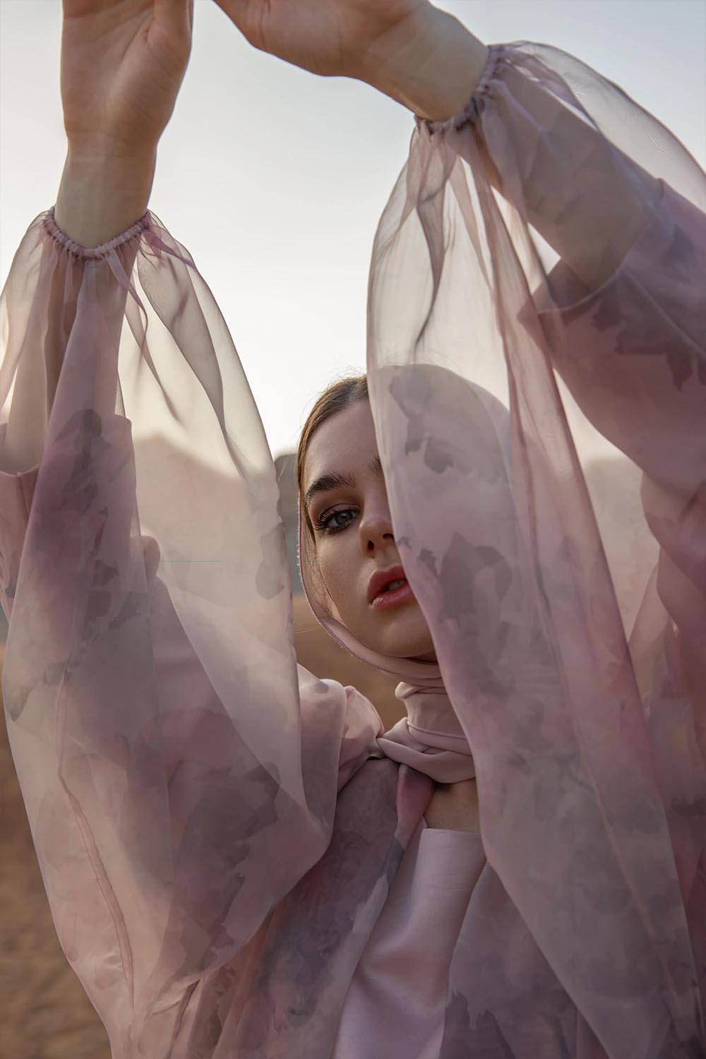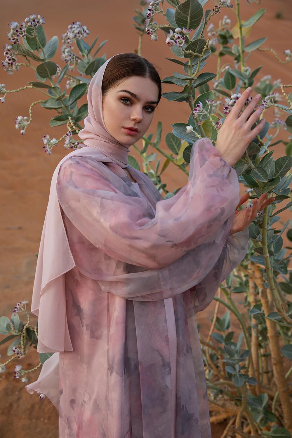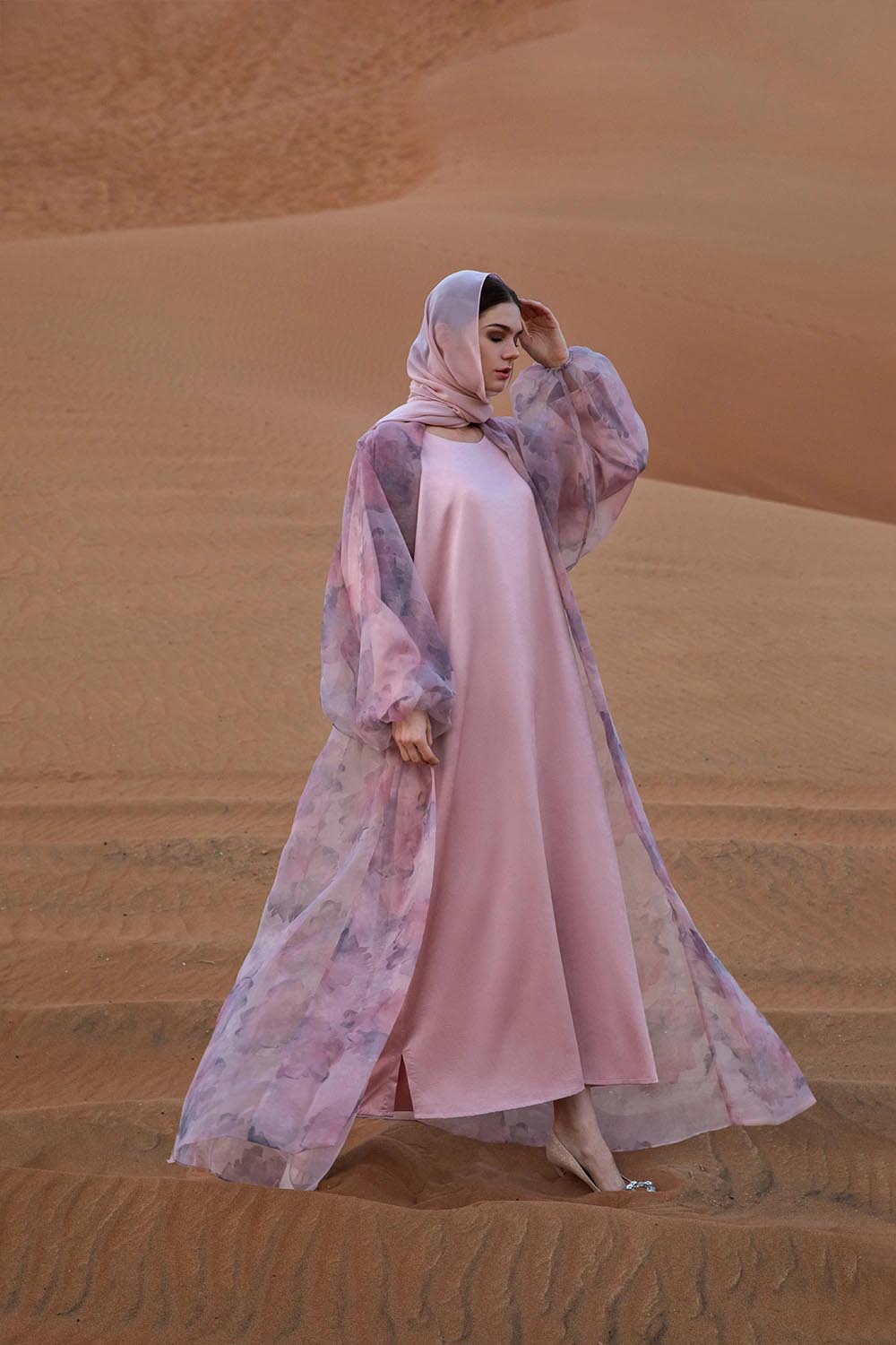A seamless organza abaya with our exclusive Suuf print and puffy sleeves. A must have feminine, staple piece. Comes with a matching inner dress and Sheila.