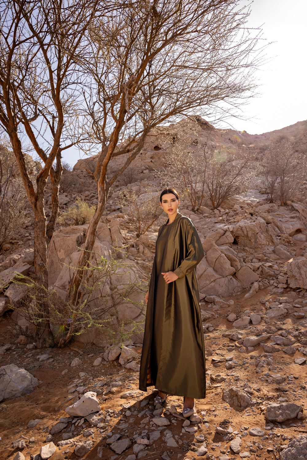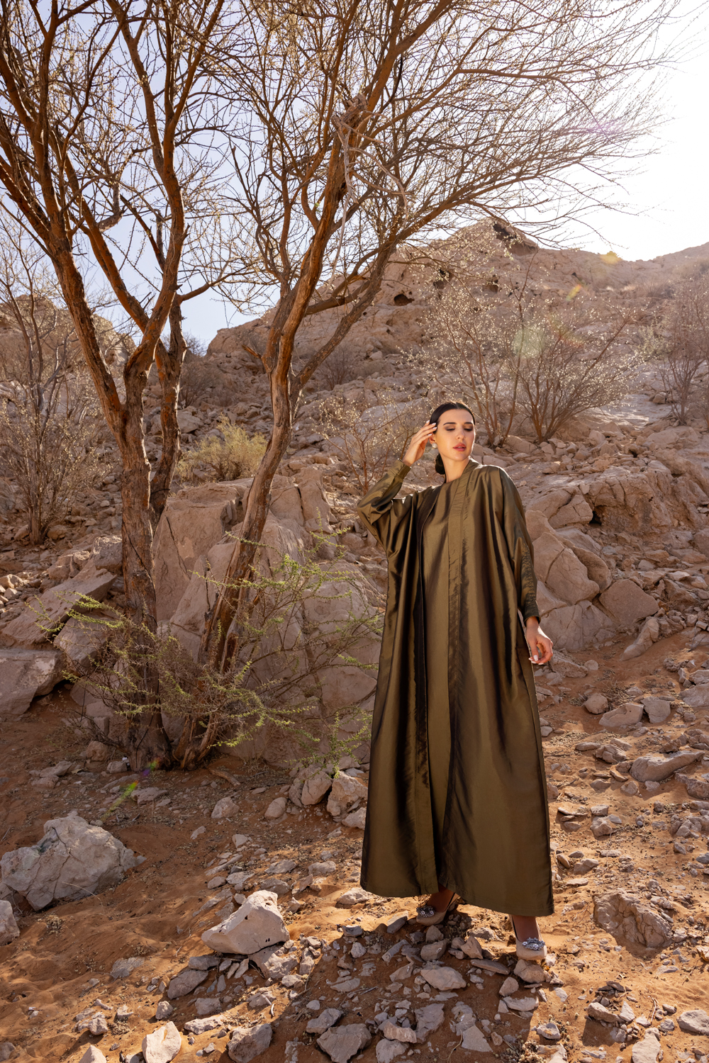 An olive green metalictafetta abaya. Detailed with A line cuts and stiches. Comes with a matching inner dress and Sheila.